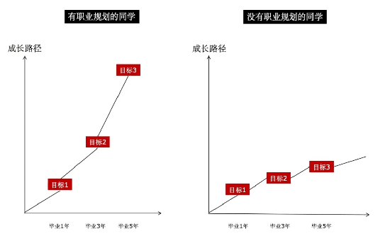 她的成长路径其实也代表了80%的同学的职业生涯初期,我们将做了职业规划同学的成长路径和没有做职业规划同学的做个对比,呈现出来就是这个样子: