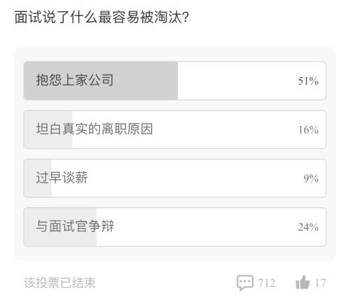 面试时因为工作经验、专业背景、学历等“硬条件”拼不过别人,而导致面试失败,大家也输得心服口服;可是如果因为你说了一些不该说的,导致面试没戏,是不是会觉得很冤?日前,我们就“面试时说了什么最容易被淘汰”这一话题进行投票,发现有51%的受访者认为“抱怨上家公司”最容易导致面试失败;有24%的受访者表示“与面试官争辩”会让面试没戏;有16%的人认为“坦白真实的离职原因”让面试“凶多吉少”;另有9%的受访者认为“过早谈薪”会让面试步入失败结局。