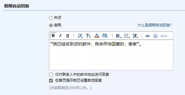 02邮件的自动回复如果找工作期间不能及时回复邮件,比如白天要长时间呆在实验室或要上课,可以给自己的邮箱设置一个自动回复,“我已经收到您的邮件,我会尽快回复的,谢谢”。