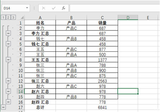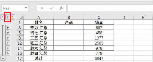 在制作好分类汇总表格之后,excel界面左侧多了一些分级标志,点击其中的数字可以收起或展开数据,比如点击数字“2”,就会收起所有原始数据,只显示汇总结果;点击数字“1”就只会显示“总计”结果。