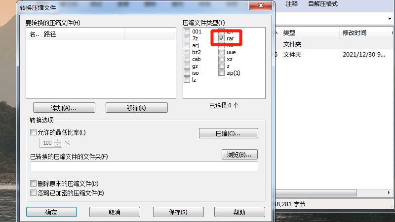 简介:1、在桌面中,双击zip文件。2、在打开的zip文件中,点击顶部工具。3、在展开的工具中,选择转换压缩文件格式。4、在展开的窗口中,选择rar格式。5、在选择格式后,点击确定即可。本视频由联想拯救者Y9000P、Windows11、录制