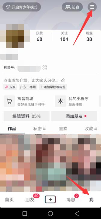 以抖音20.2.0为例,抖音默认自己才能查看收藏列表,不能设置让别人看到自己的收藏,但可以设置让别人看到自己的喜欢和点赞信息。分为3步,具体步骤如下:打开抖音APP,点击右下角的我,选择三横图标。
