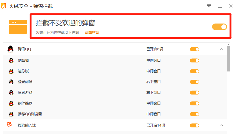 在弹窗拦截界面中,将拦截不受欢迎的弹窗开启即可。