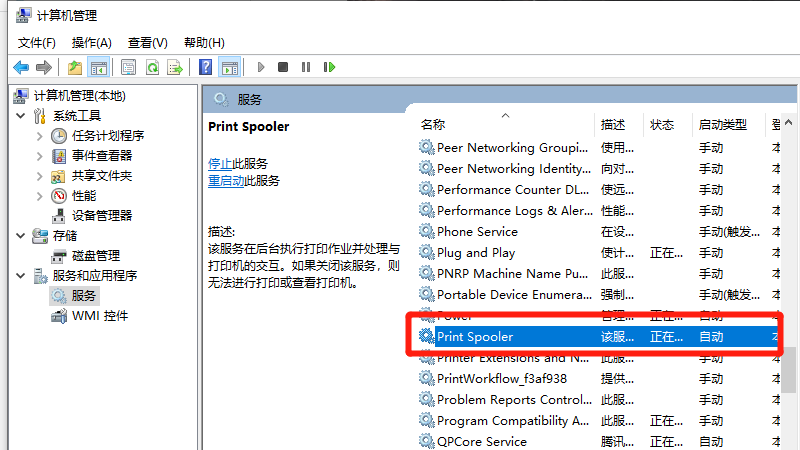 在展开的服务中,双击Print Spooler服务。