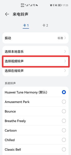 在来电铃声界面中,选择视频铃声。
