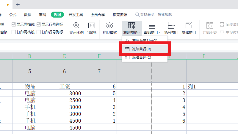 在展开的选项中,选择冻结首行即可。