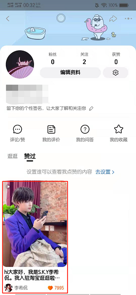 淘宝里面点了红心的视频在逛逛里的赞过看。以vivos9手机为例,查看淘宝里面点了红心的视频的步骤共需3步。具体操作步骤如下:在逛逛的界面中,点击头像。