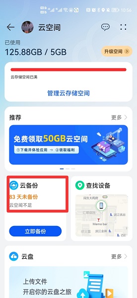 恢复手机删除的短信可以通过手机云备份进行恢复。以手机华为p50为例,恢复手机删除的短信的步骤分为4步,具体操作如下:在手机云空间界面中,点击云备份。