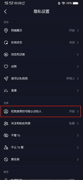 在隐私设置的界面中,点击把我推荐给可能认识的人。