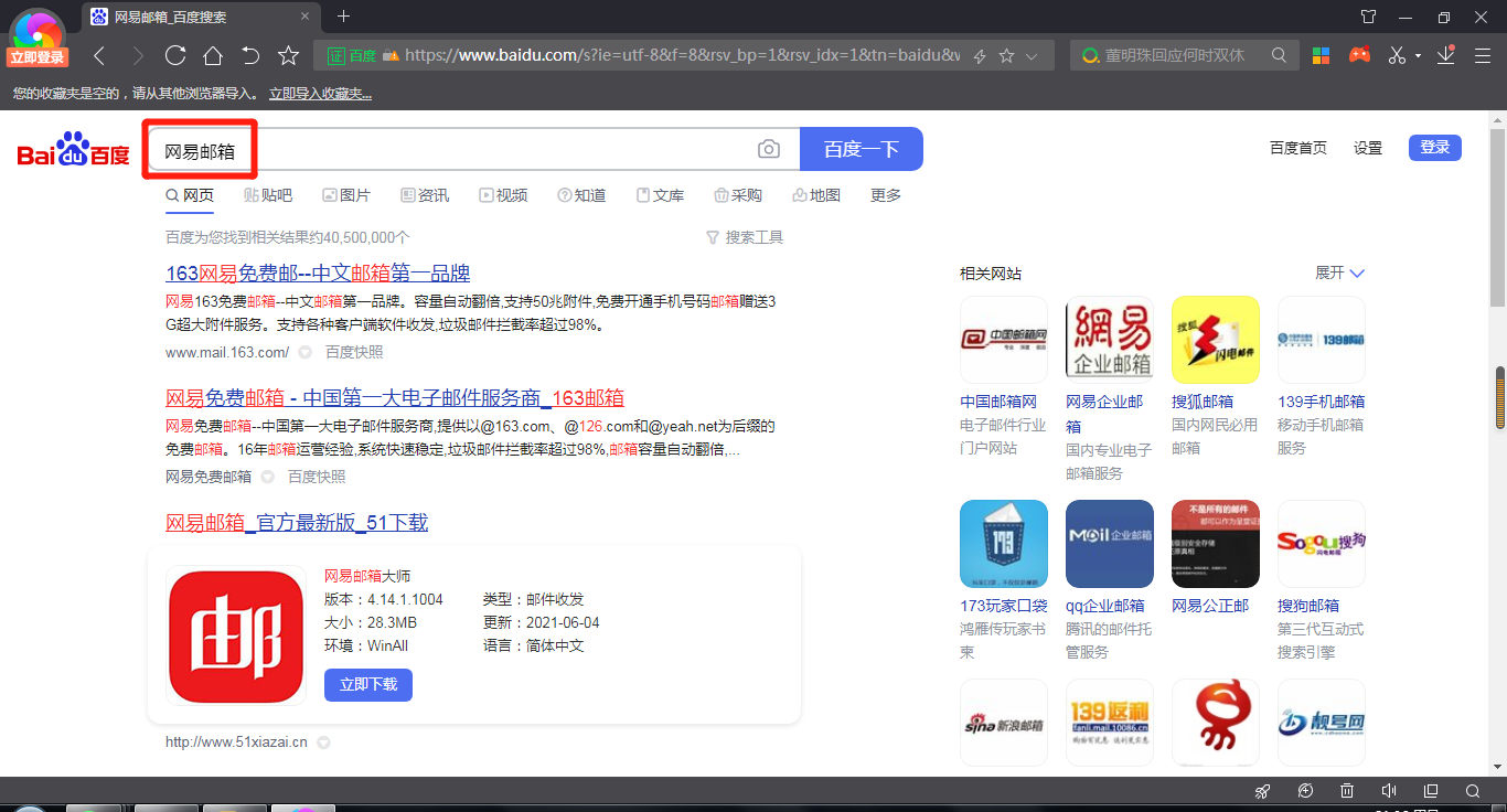 电脑邮箱可以在邮箱的首页中登录。以Redmibook Pro 15电脑为例,登陆网易邮箱的步骤共需4步。具体操作步骤如下:在百度搜索框的界面中,输入网易邮箱。