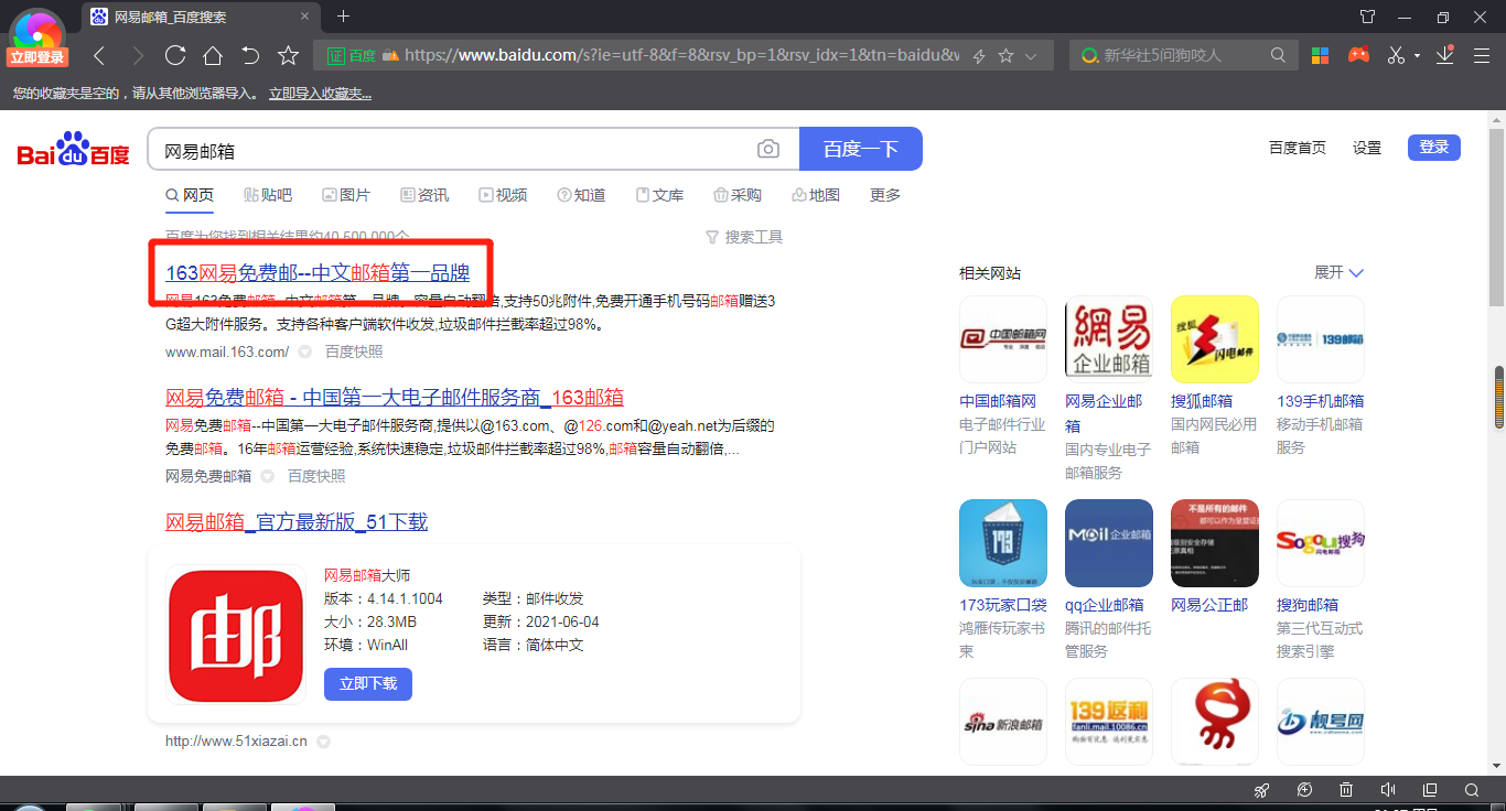在搜索结果的界面中,点击163网易邮箱。