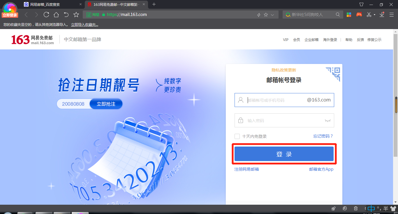 在网易邮箱的首页中,输入邮箱账号/手机号码和密码。