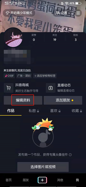 修改自己的抖音号就是设置抖音下载水印。以vivos9手机为例,修改抖音号的步骤共需4步。具体操作步骤如下:在我的界面中,点击编辑资料。