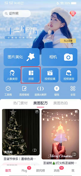 美图秀秀可以使用拼图的功能将两张图p到一起。以vivos9手机为例,美图秀秀将两张图p到一起的步骤共需4步。具体操作步骤如下:在美图秀秀首页的界面中,点击拼图。
