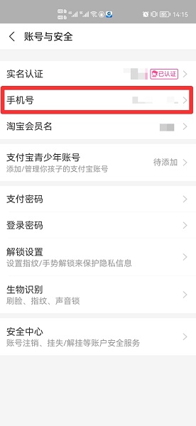 在账号与安全界面中,点击手机号。