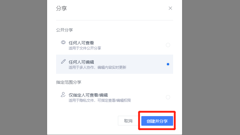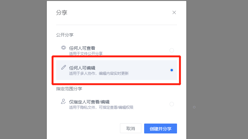 简介:1、在金山文档界面中,点击新建。2、在展开的选项中,点击文档。3、在新建文档界面中,点击分享。4、在展开的窗口中,选择任何人可编辑。5、在设置公开分享后,点击创建并分享即可。本视频由联想拯救者Y9000P、Windows11、录制