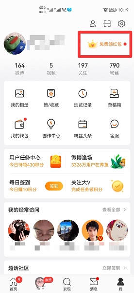领取微博超话补签卡需要在会员的用户中心中进行领取即可。以手机华为p50为例,领取微博超话补签卡的步骤分为3步,具体操作如下:在微博我的界面中,点击免费领红包。