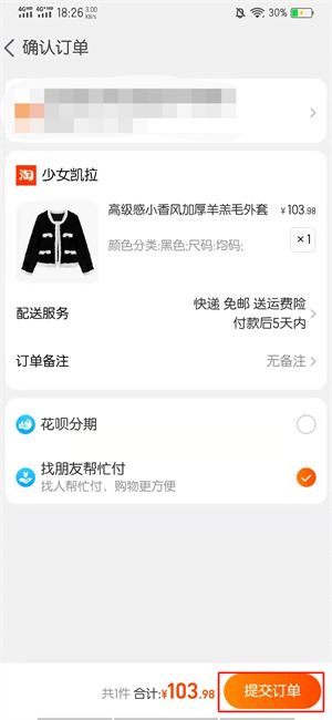 在点击找朋友帮忙付之后,点击提交订单。