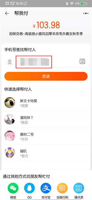 在帮我付的界面中,输入对方手机号。