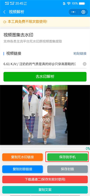 在视频解析的界面中,点击保存到手机即可。