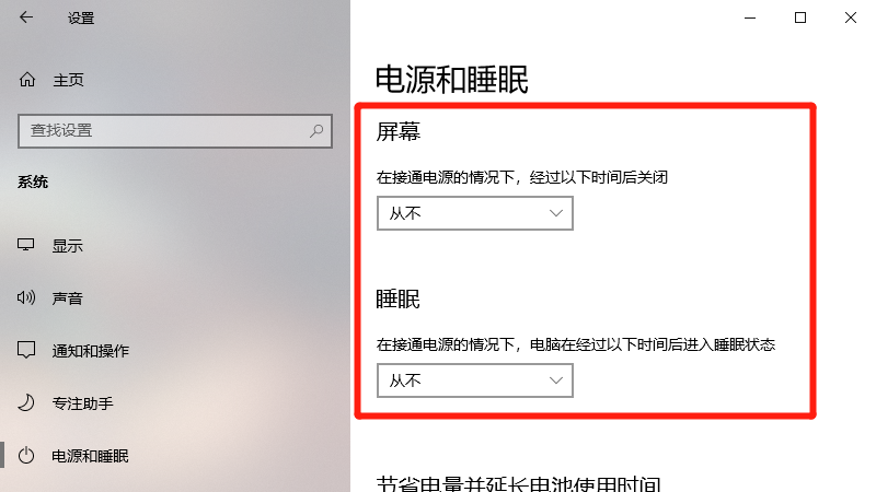 在展开的选项中,设置屏幕和睡眠为从不即可。