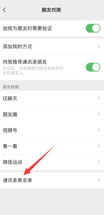 点击朋友权限,进入页面,点击通讯录黑名单。
