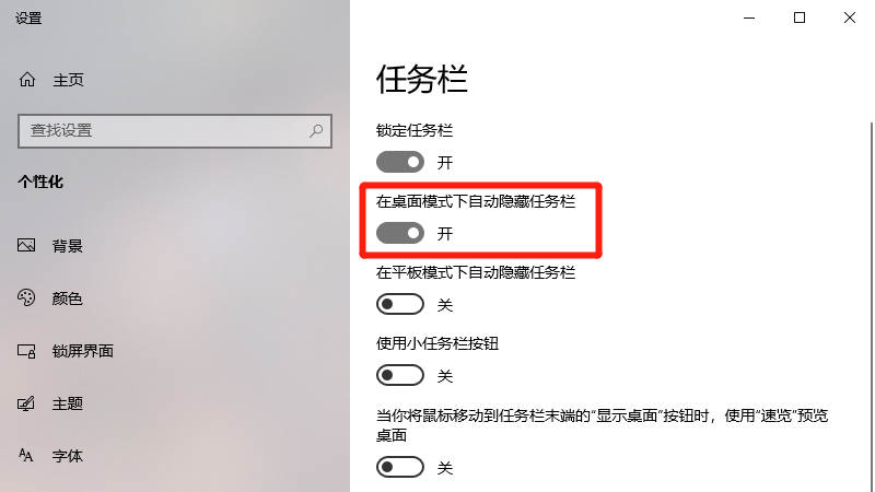 在展开的窗口中,将桌面模式下自动隐藏任务栏开启即可。