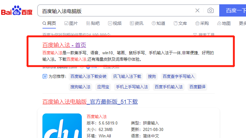 电脑下载输入法可以在百度中,搜索并下载输入法即可。以电脑联想拯救者Y9000P为例,电脑下载输入法的步骤分为2步,具体操作如下:在百度搜索结果界面中,点击输入法进入官网。