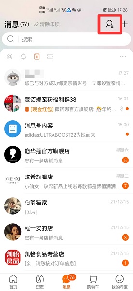 取消淘宝亲情卡需要在淘宝亲情账号中进行取消即可。以手机华为p50为例,取消淘宝亲情卡的步骤分为4步,具体操作如下:在淘宝消息界面中,点击顶部通讯录图标。