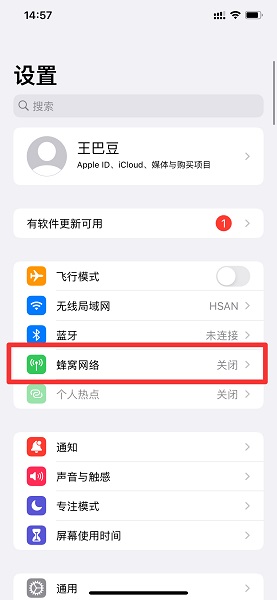 打开app与数据需要在手机设置的蜂窝网络中进行操作即可。以手机iPhone 12为例,打开app与数据的步骤分为3步,具体操作如下:在手机设置界面中,点击蜂窝网络。