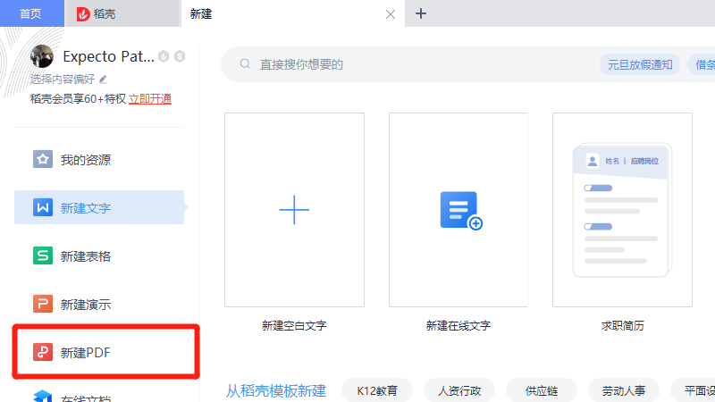 在展开的新建中,选择新建PDF。