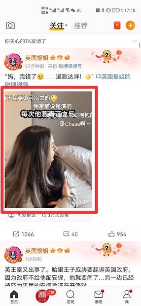 微博下载的视频不能保存到本地,只能下载至微博的离线缓存中。以手机华为p50为例,微博下载视频的步骤分为4步,具体操作如下:在微博界面中,点击视频。
