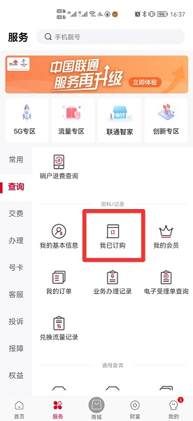 简介:1、在中国联通服务界面中,点击查询。2、在展开的选项中,点击我已订购。3、在展开的界面中,选择已开通的业务。4、在展开的界面中,点击关闭服务即可。本视频由华为p50、HarmonyOS 2.0.0、微信 8.9.4录制