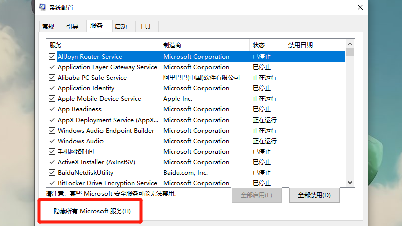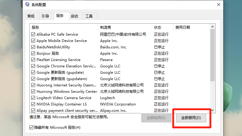 在勾选隐藏所有Microsoft服务后,点击全部禁用即可。