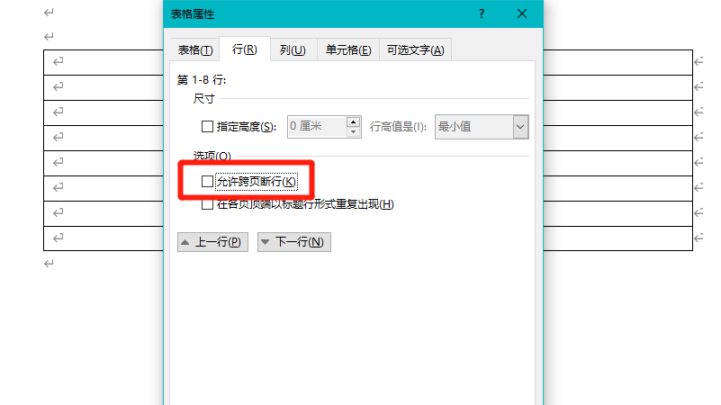 在展开的选项中,将允许跨页断行取消勾选即可。