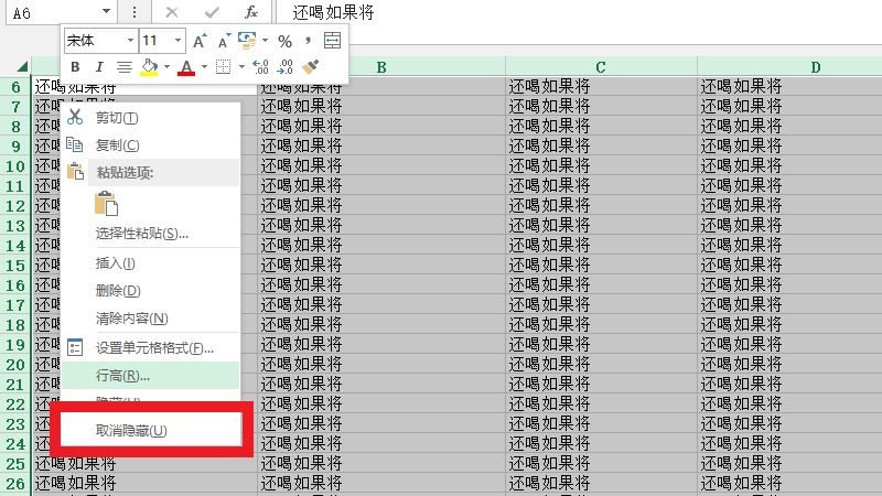 在右击选中的单元格后,点击取消隐藏即可。