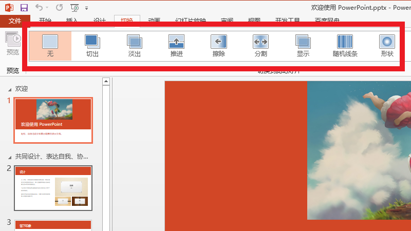 简介:1、在PPT界面中,点击顶部切换。2、在展开的选项中,选择切换方式即可。本视频由联想拯救者Y9000P、Windows 11、PPT 2016录制