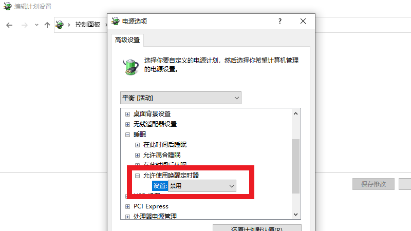 在展开的窗口中,将允许使用唤醒定时器为禁用即可。