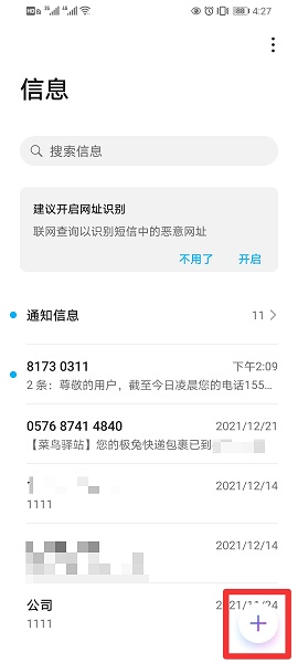 10086短信查话费明细需要发送话费查询至10086即可。以手机华为p40为例,10086短信查话费明细的步骤分为3步,具体操作如下:在信息界面中,点击右下角加号。