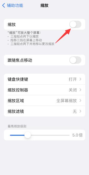 点击缩放,打开缩放,三指轻点两下缩放,拖移三指屏幕上移动,三指轻点两下拖移更改缩放,关则不移动。