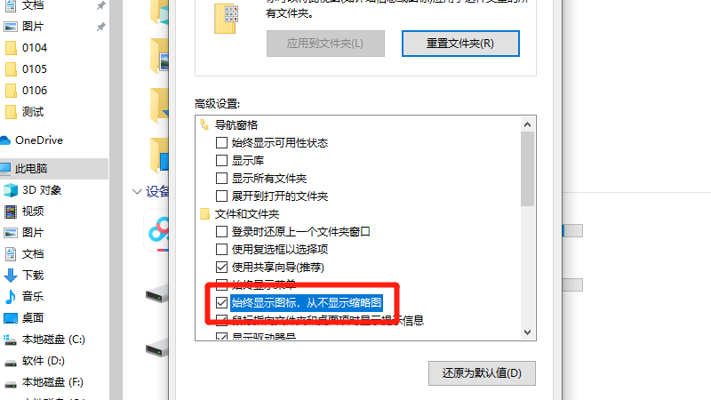 在展开的界面中,勾选始终显示图标,从不显示缩略图即可。