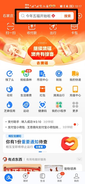 小荷包的钱取出来需要在支付宝小荷包中,选择转出并选择确认转出到余额即可。以手机华为p50为例,小荷包的钱取出来的步骤分为5步,具体操作如下:在支付宝界面中,点击顶部搜索框。