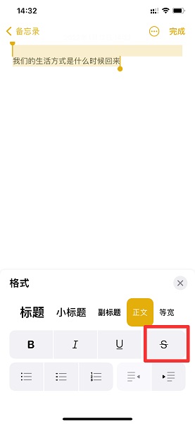 简介:1、在备忘录界面中,全选文字。2、在全选文字后,点击格式。3、在展开的界面中,点击删除线即可。本视频由iPhone 12、iOS15.4、录制
