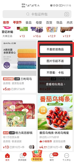 拼多多不喜欢的商家是无法屏蔽的,只能将商品设置为不喜欢该商品。以手机华为p50为例,设置商品为不喜欢该商品的步骤分为2步,具体操作如下:在拼多多界面中,长按商品。