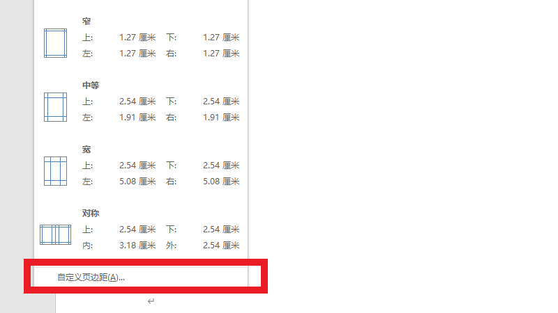 在展开的界面中,点击自定义页边距。