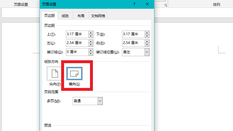 在展开的界面中,点击横向。