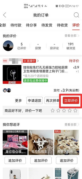 拼多多不能匿名购买东西,可以匿名评价。以手机华为p50为例,拼多多匿名评价的步骤分为4步,具体操作如下:在拼多多我的界面中,点击评价。