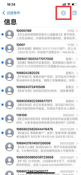 iphone删除的短信是不能恢复的。以手机iPhone 12为例,iphone删除短信的步骤分为4步,具体操作如下:在手机信息界面中,点击顶部三点图标。