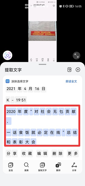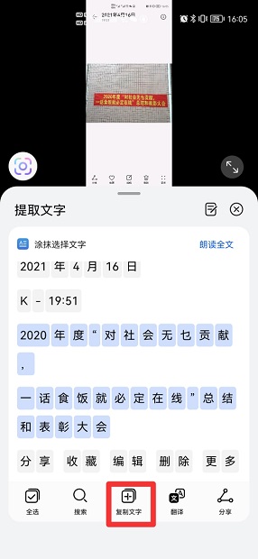 简介:1、在手机相册中,双指长按屏幕。2、在展开的界面中,选择文字。3、在选中文字后,点击复制即可提取。本视频由华为p50、HarmonyOS 2.0.0、录制
