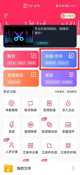 手机制作音频文件可以在音频音乐剪辑中进行操作即可。以手机华为p50为例,手机制作音频文件的步骤分为4步,具体操作如下:在音频音乐剪辑中,点击拼接/合并。